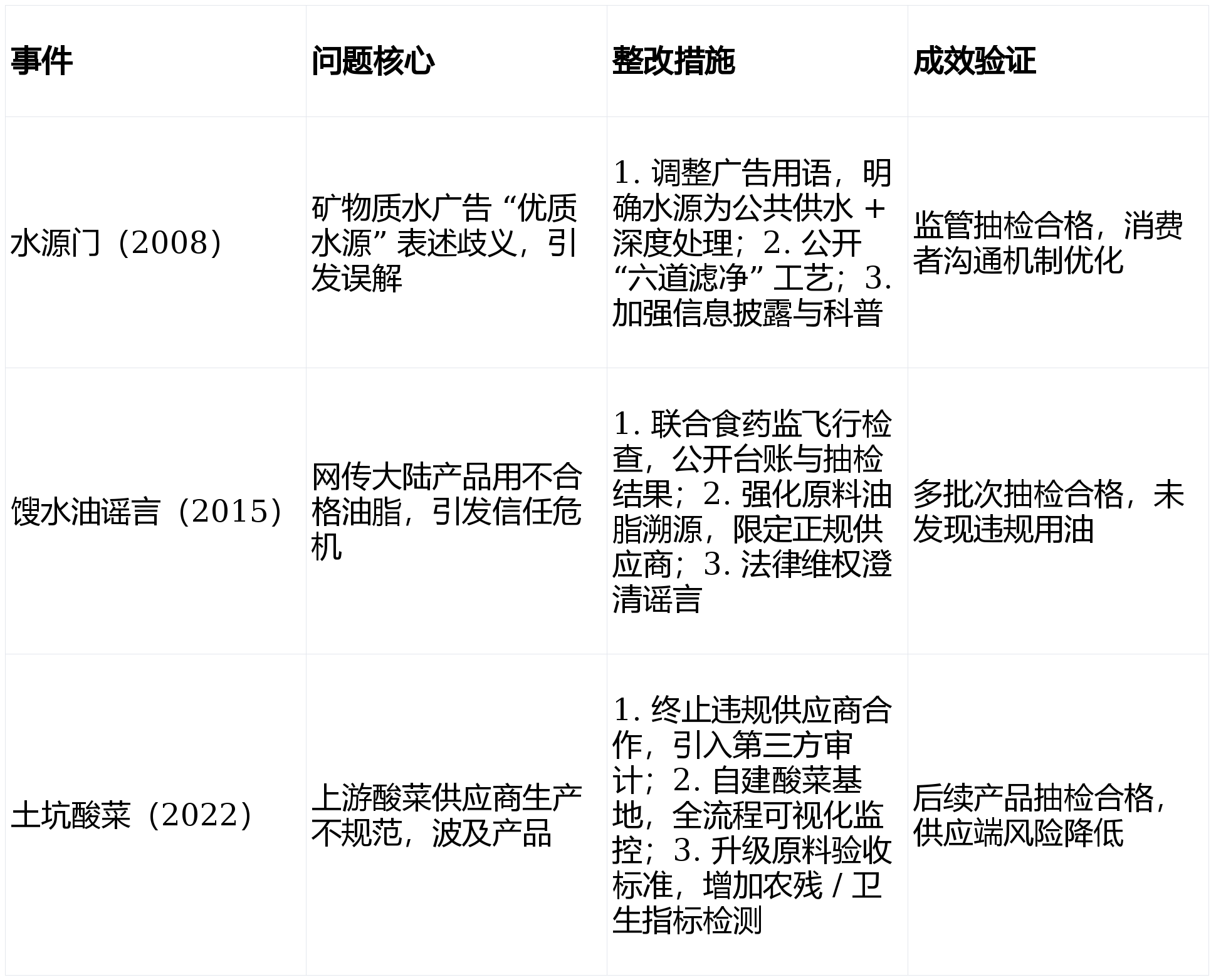 康师傅过) “三道防地 + 全流程 HACCP + 数字化逃溯” 建立闭环管控,过往质量问题多聚焦供应链取消息披露,过程节制:“日管控、周排查、月安排”,环节原料(油、面、添加剂)加严检测,